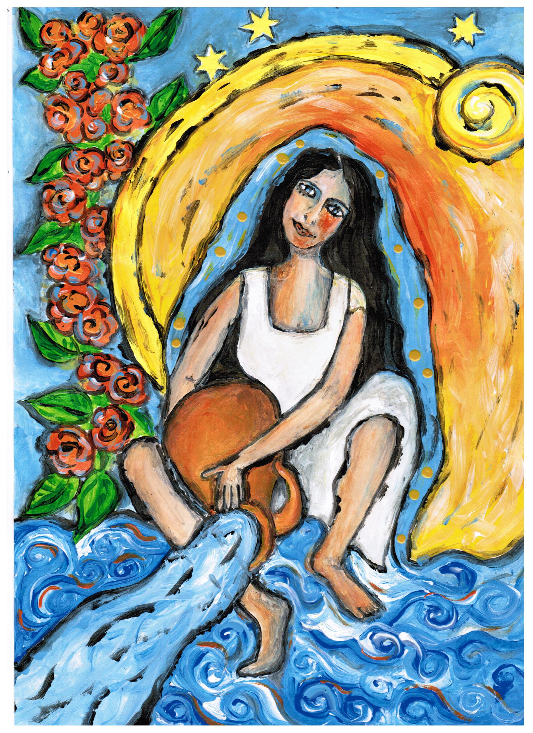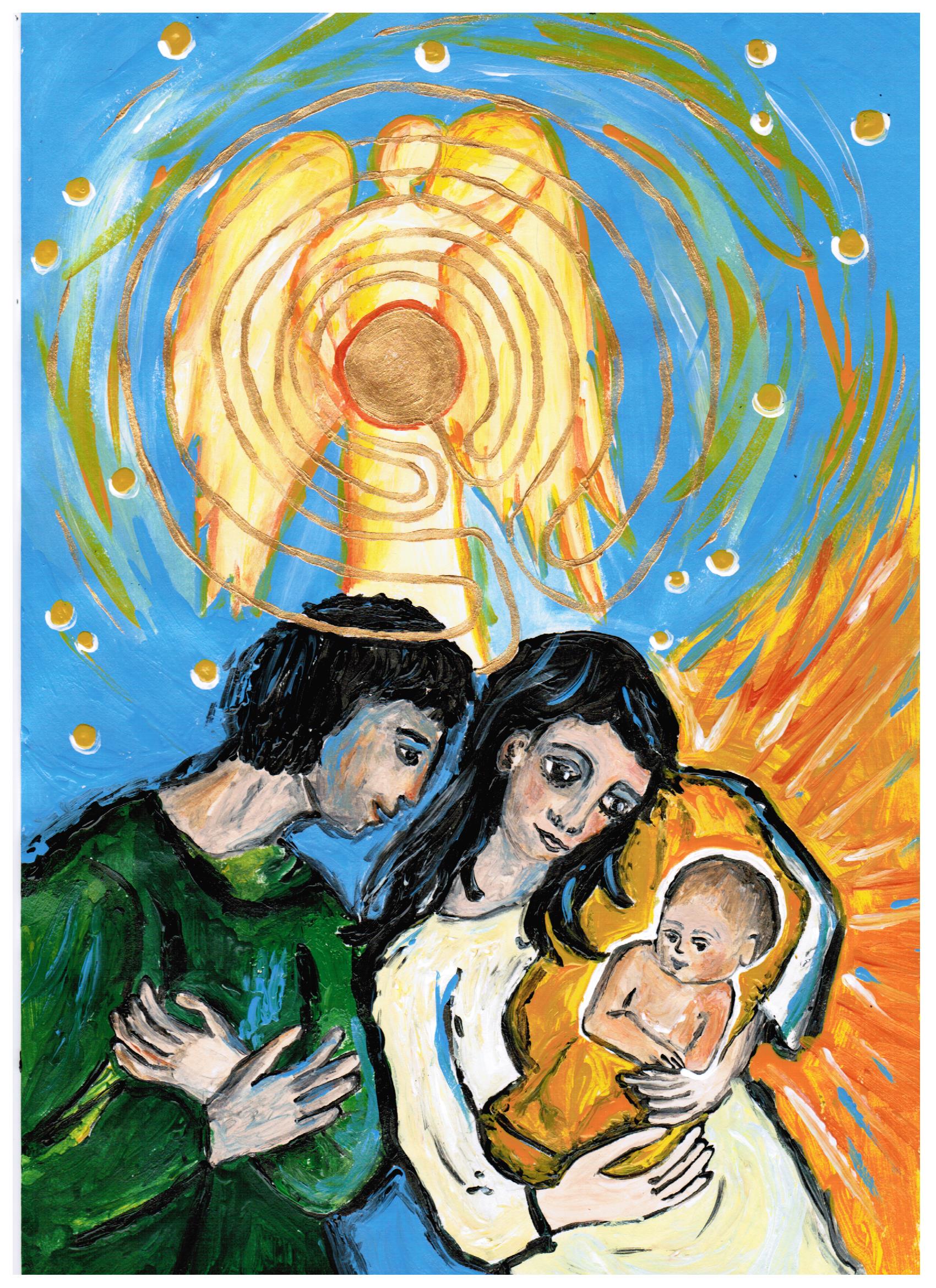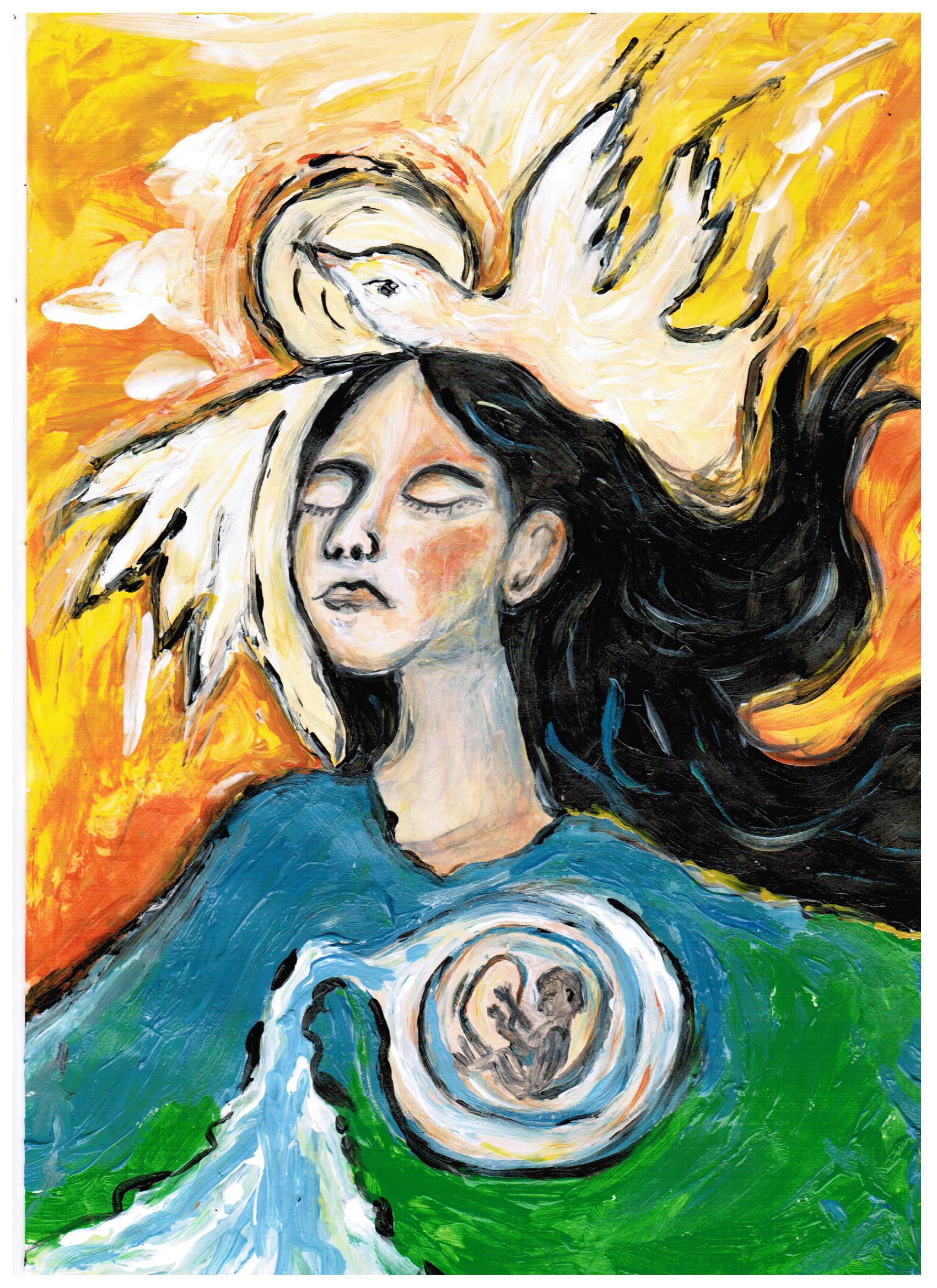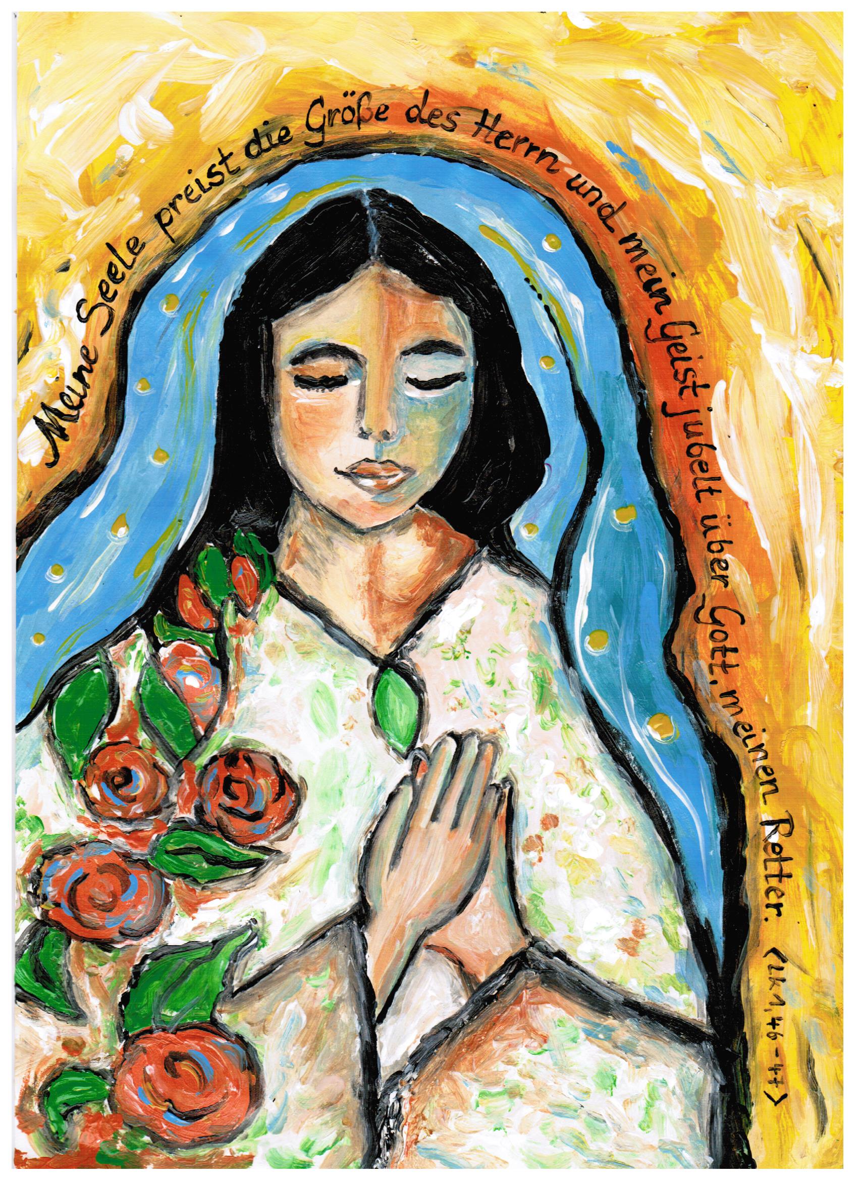 Ich habe mich von dem Thema inspirieren lassen, das mich das ganze Jahr schon beschäftigt: „Frauen – starke Persönlichkeiten“. Angefangen habe ich mit der Weiblichkeit von Maria. Sie ist jung, selbstbewusst, mit wehendem Haar, eine Persönlichkeit die sich entscheidet und dabei ganz sie selbst bleibt. Ohne ihre mutige Lebensentscheidung wäre alles so nicht ins Rollen gekommen.