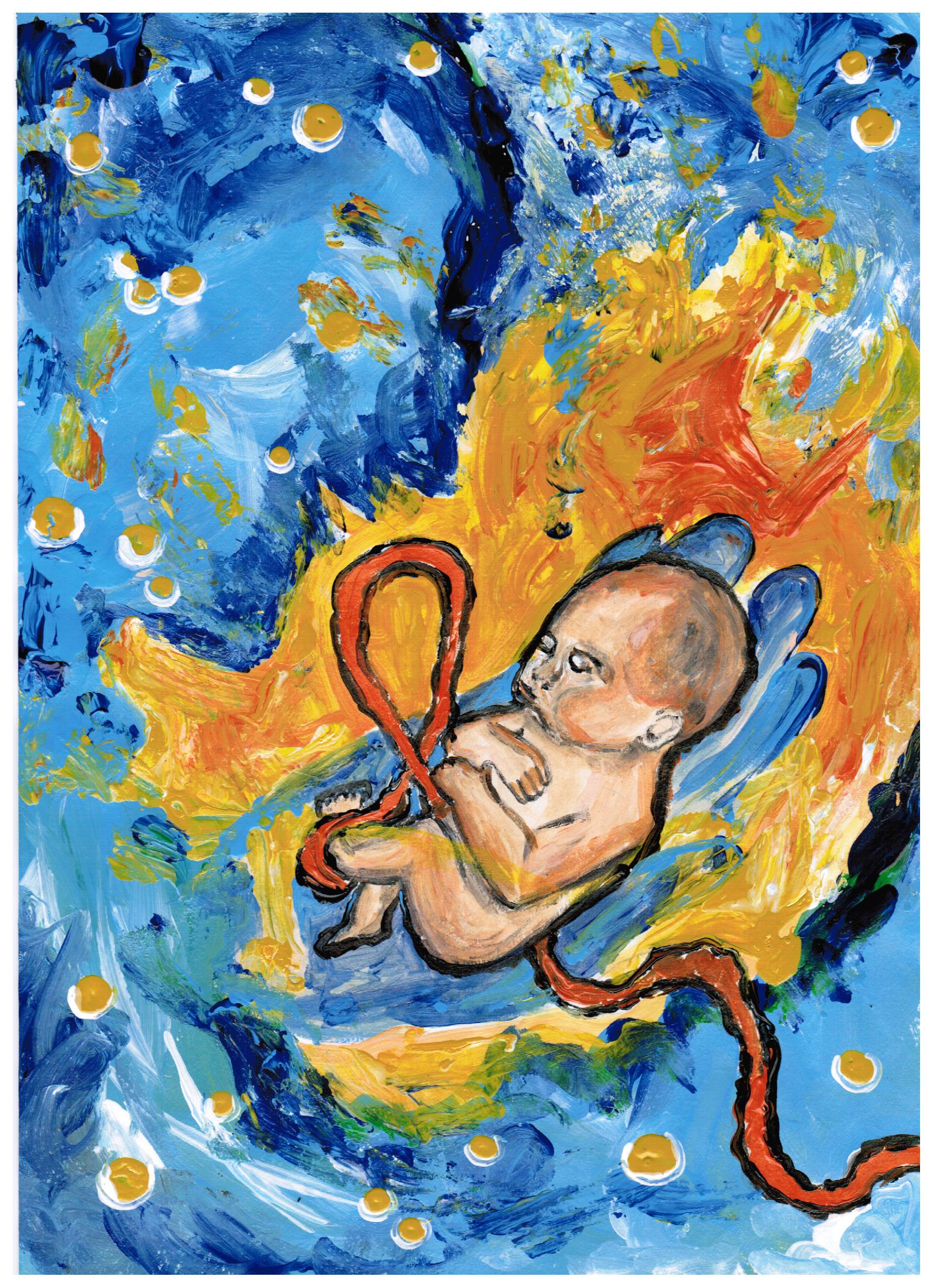 Die Bilder sind alle sehr deutlich gemalt, nichts verschwimmt in malerischer Ungewissheit, mit einer Ausnahme, das Bild des Weltalls, wo die Göttlichkeit übergeht an das Kind im Mutterleib, noch vollkommen verletzlich und leer aber offen und dicht gefüllt bis an den höchsten Rand.