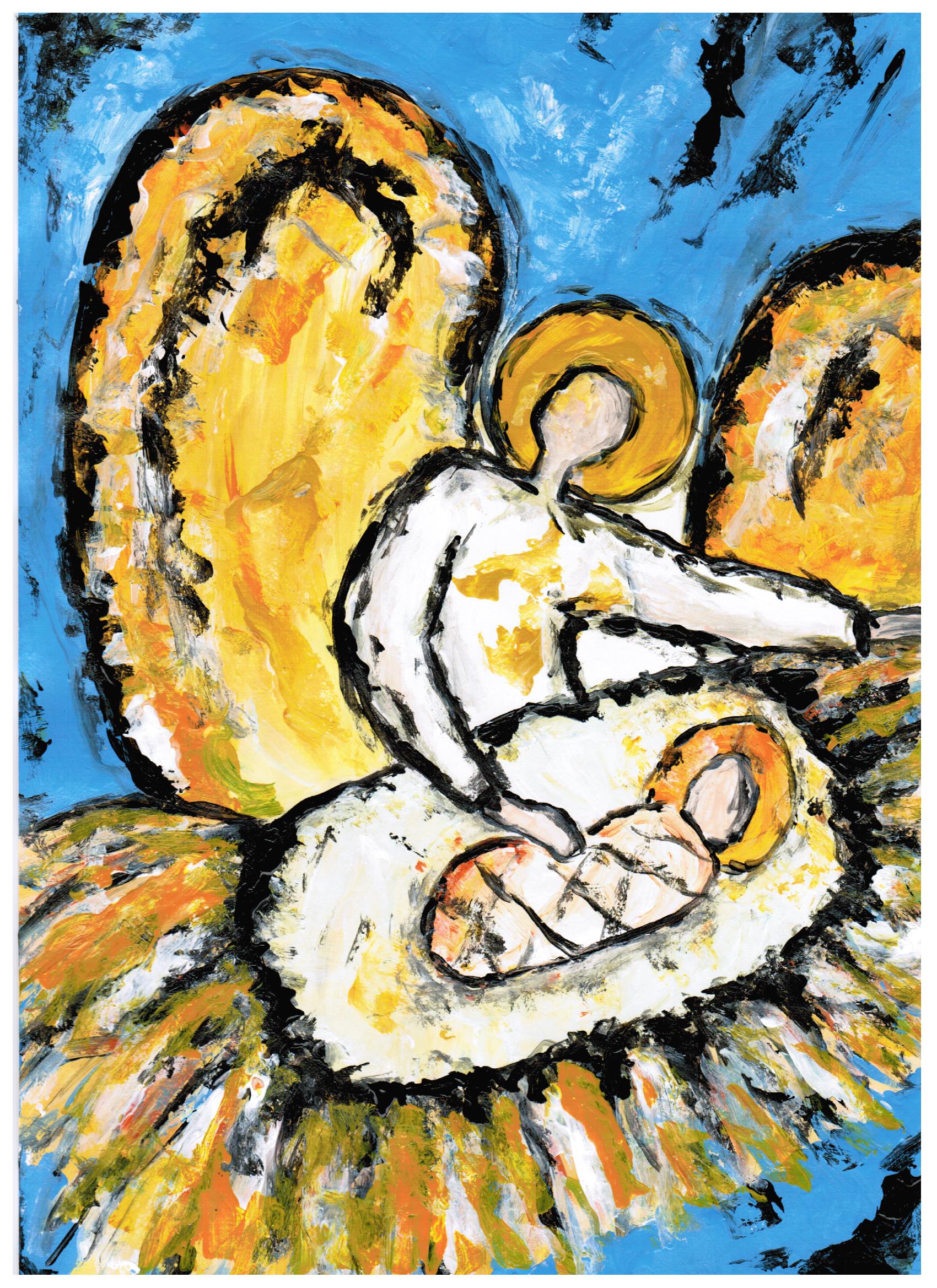 In deinen neuen Bildern sind neben traditionellen auch moderne Symbole eingearbeitet wie zum Beispiel ein Laptop an der Krippe. Welche Rolle spielen diese und welche Botschaft hast du dadurch in die Bildergesteckt?