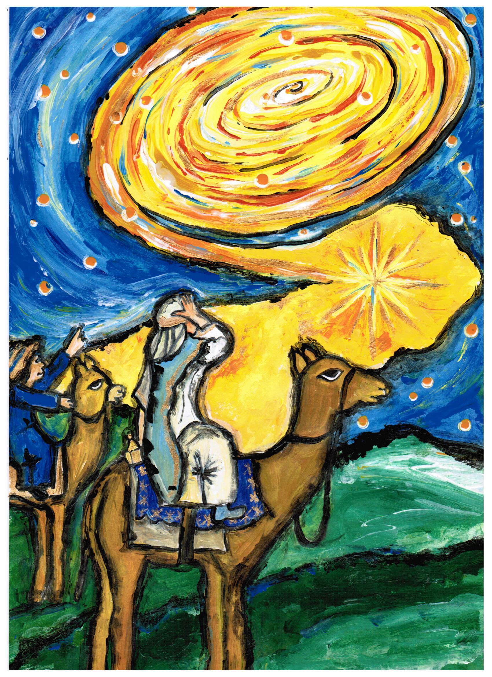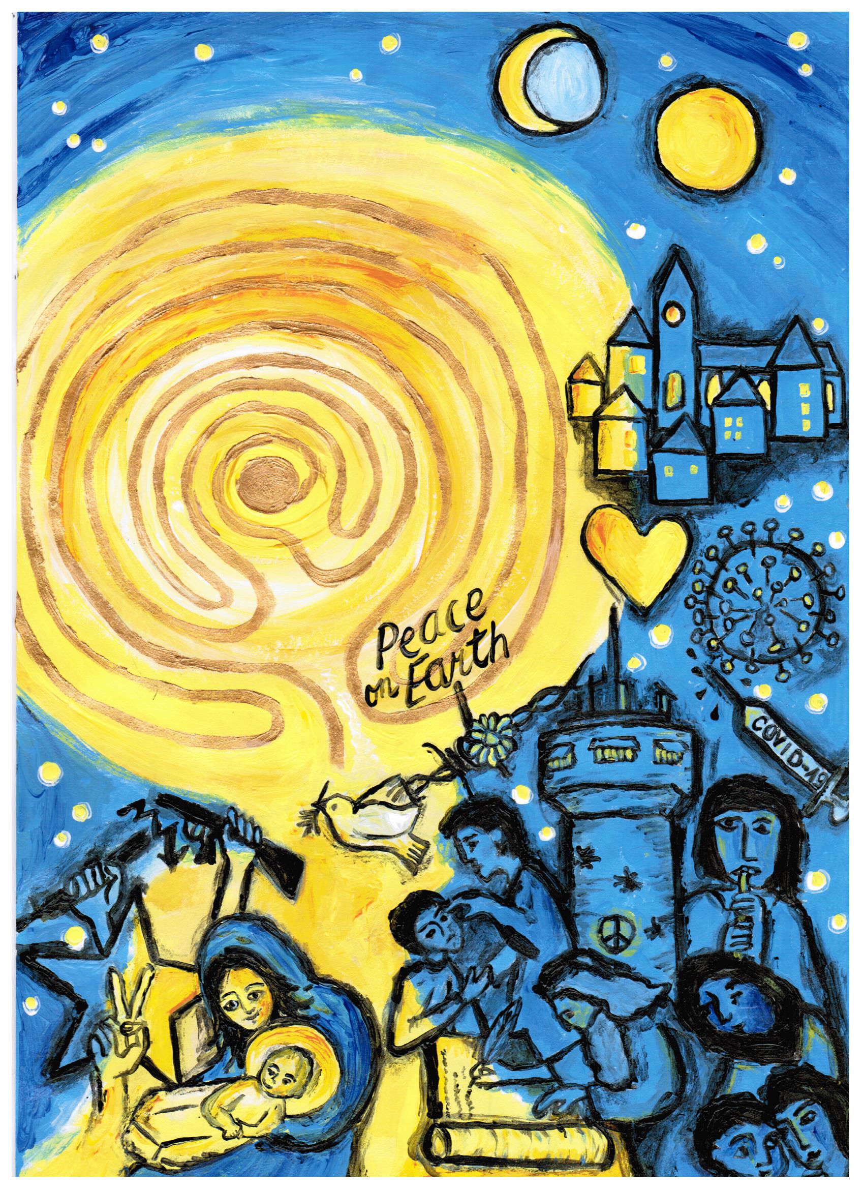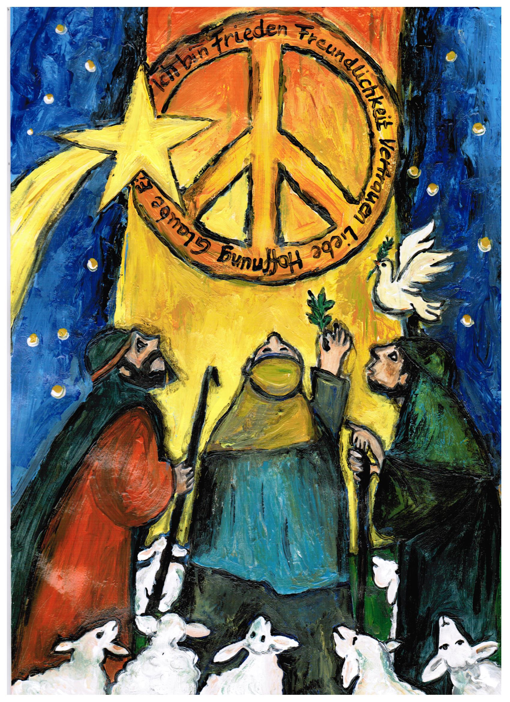 Das Licht der Menschwerdung sollte durch die Bilder strahlen, in zwei Komplementärfarben Gelb und Blau, Zeichen für Tag und Nacht, Zeichen für das, was dazwischen liegt, ergänzt nur durch die Mischfarben Grün und Orange. Schwarz konturiert die Bilder, setzt Schatten und Wirklichkeiten und lässt sie auf ihre Weise strahlen. Sie brechen eindrücklich in die Wirklichkeit der Betrachtenden vor.