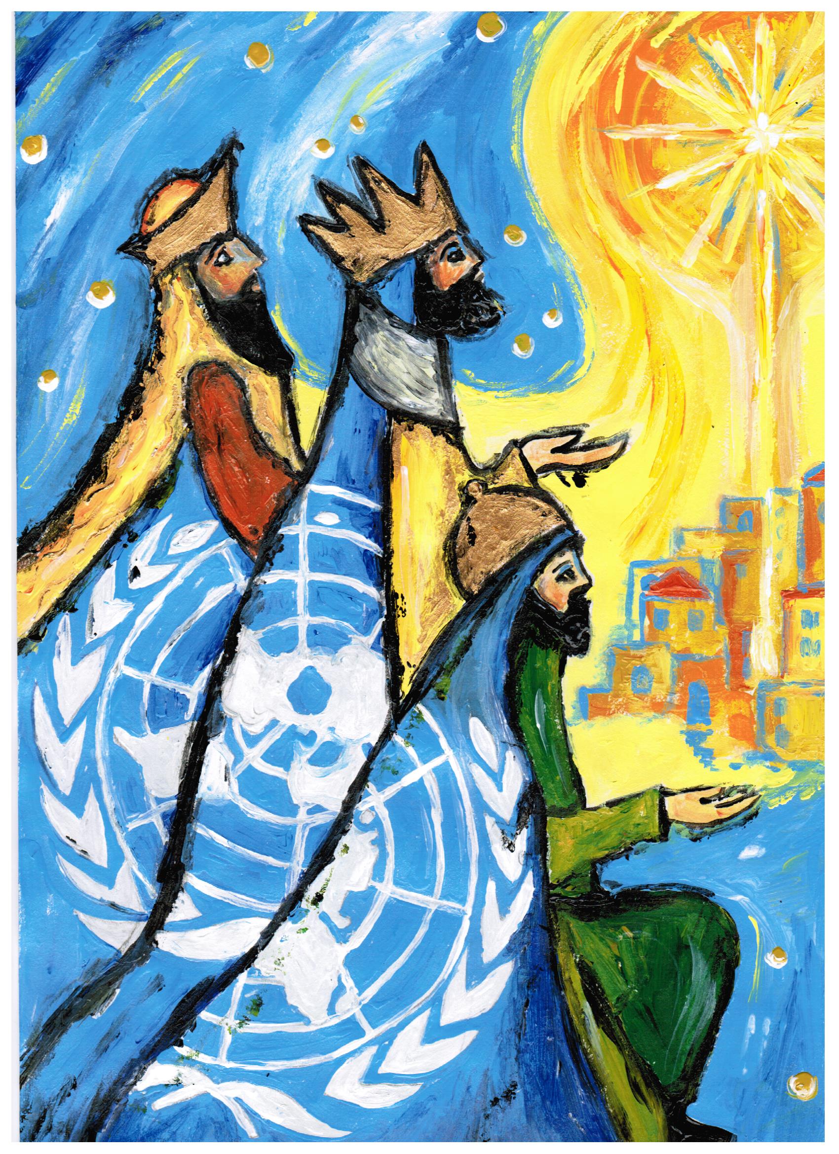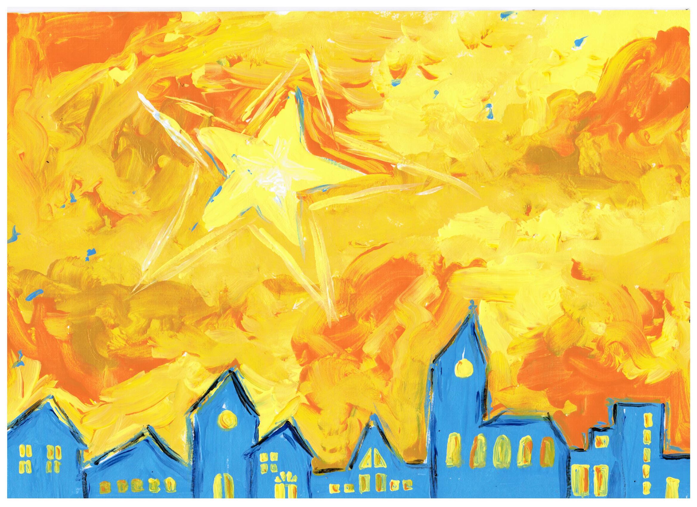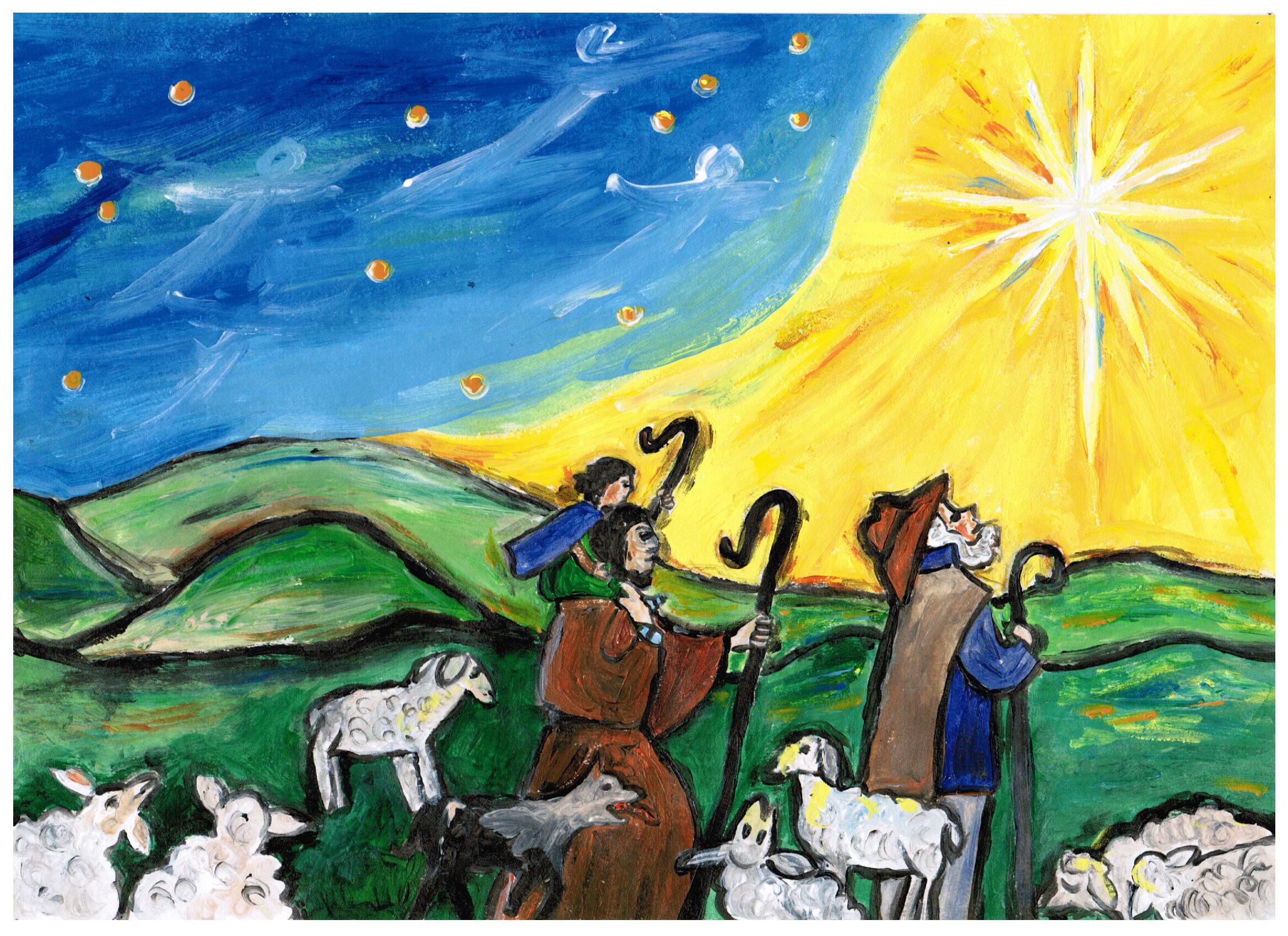 Das Licht der Menschwerdung sollte durch die Bilder strahlen, in zwei Komplementärfarben Gelb und Blau, Zeichen für Tag und Nacht, Zeichen für das, was dazwischen liegt, ergänzt nur durch die Mischfarben Grün und Orange. Schwarz konturiert die Bilder, setzt Schatten und Wirklichkeiten und lässt sie auf ihre Weise strahlen. Sie brechen eindrücklich in die Wirklichkeit der Betrachtenden vor.